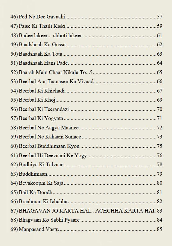 شامل ۹۵ داستان منتخب از مجموعه داستانهای اکبر و بیربل که قرنها سینهبهسینه در فرهنگ هندی نقل شدهاند.